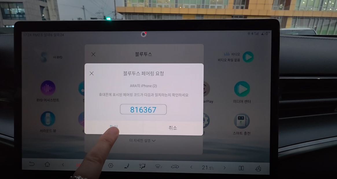 - 메인 > 블루투스 또는 전화 > 신규기기연결> 스마트폰에서 블루투스 기기 선택 > "BYD" 선택 > 스마트폰에서 페어링으로연결 클릭> 완료