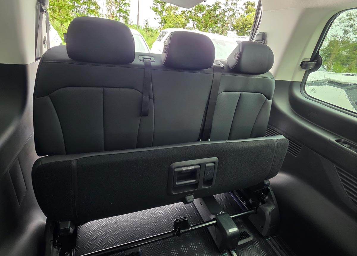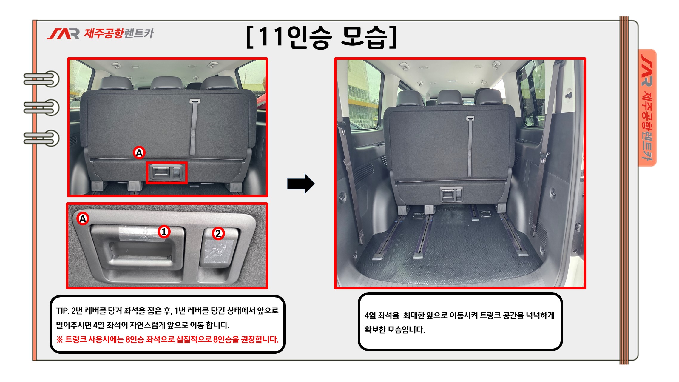 4열 의자 하단의 레버를 당기며 의자를 밀거나 당기면 트렁크 공간을 넓힐 수 있습니다. 그리고 등받이 회색끈을 당기면 의자를 다시 세울 수 있습니다.