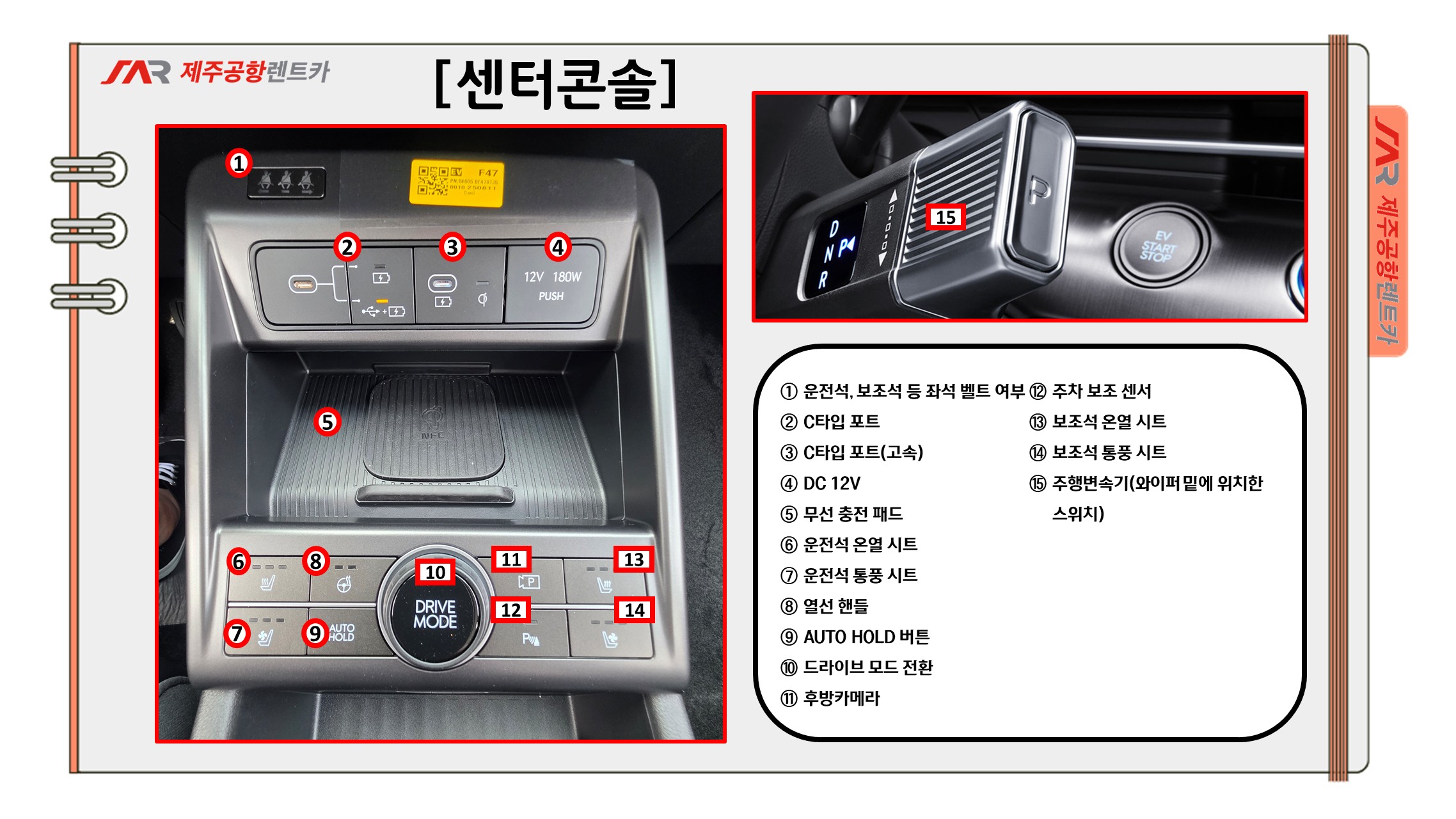 운전석에는 USB-C단자 2개와 12V단자가 설치 되어 있습니다.
